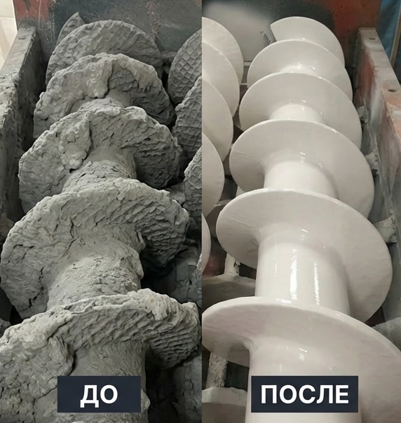 - защита от налипаний влажной и сухой сырьевой смеси (мел, глина, песок, цемент и др.) шнеков и другого технологического оборудования